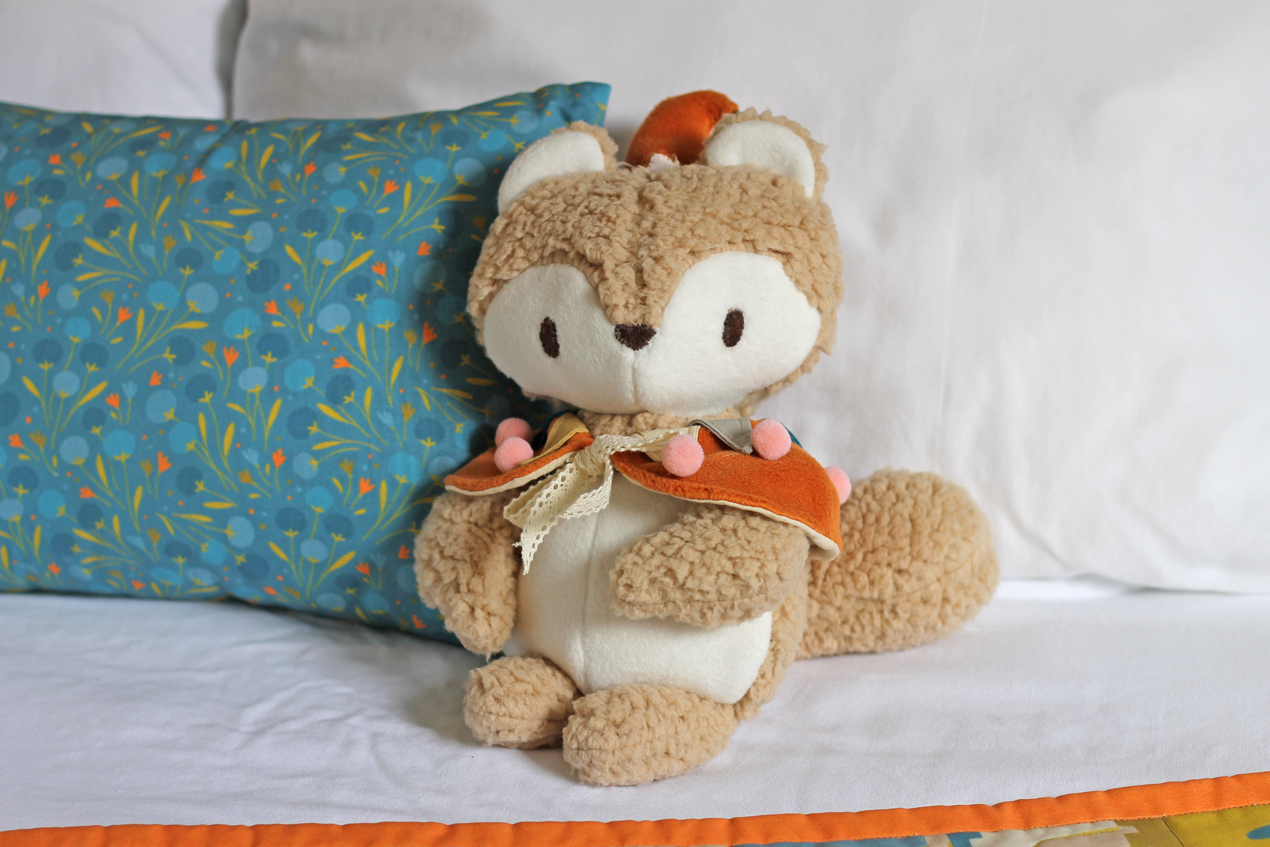 Meet my little jester chipmunk plush! She is a sweet, soft, and silly friend! I made her pattern myself and brought her to life by machine and hand-sewing. My favorite details are the pom-poms on her cape and the bell on the tip of her hat!